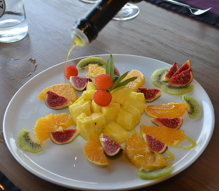 Fruit salad drizzled with tangerine-flavored olive oil at Clos Pons luncheon. Photo: Carolyn Worthington