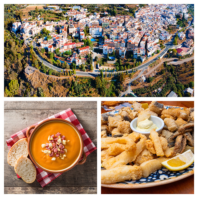 (Clockwise from top) Lanjaron aerial panoramic view. Lanjaron is a town in the Alpujarras area in the province of Granada in Andalusia Spain; freshly fried seafood (pescaíto frito); salmorejo, a rich tomato-based soup. Photos: Deposit Photos