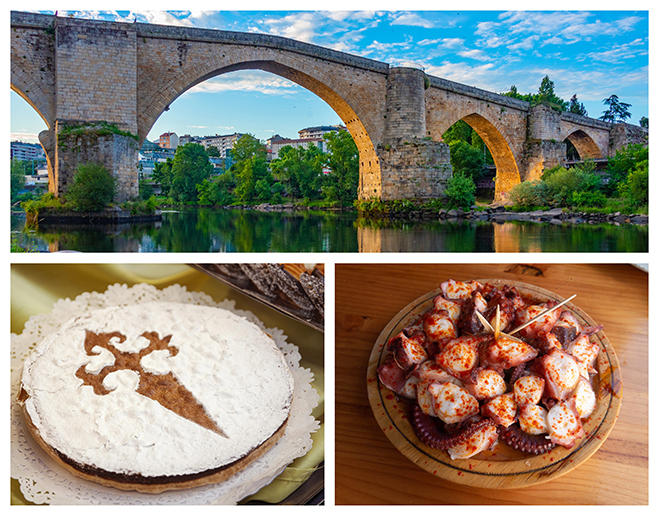 (Clockwise, top) Ponte Romana, Ourense; beloved octopus dish pulpo a feira; region’s signature almond cake, tarta de Santiago. Photos: Deposit Photos